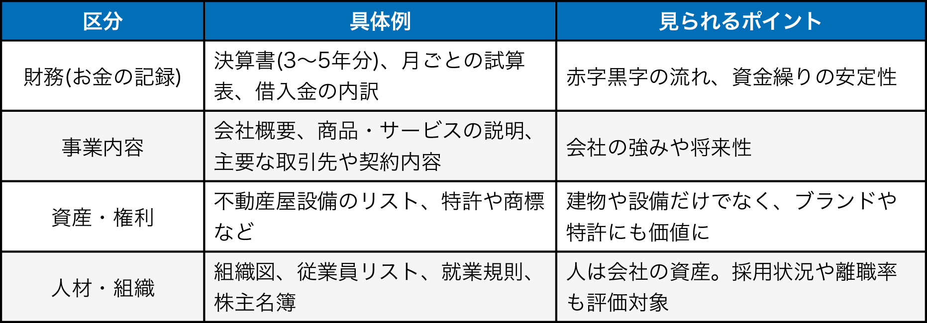 M&A では大きく分けて 4 つの分野 の資料が必要です。